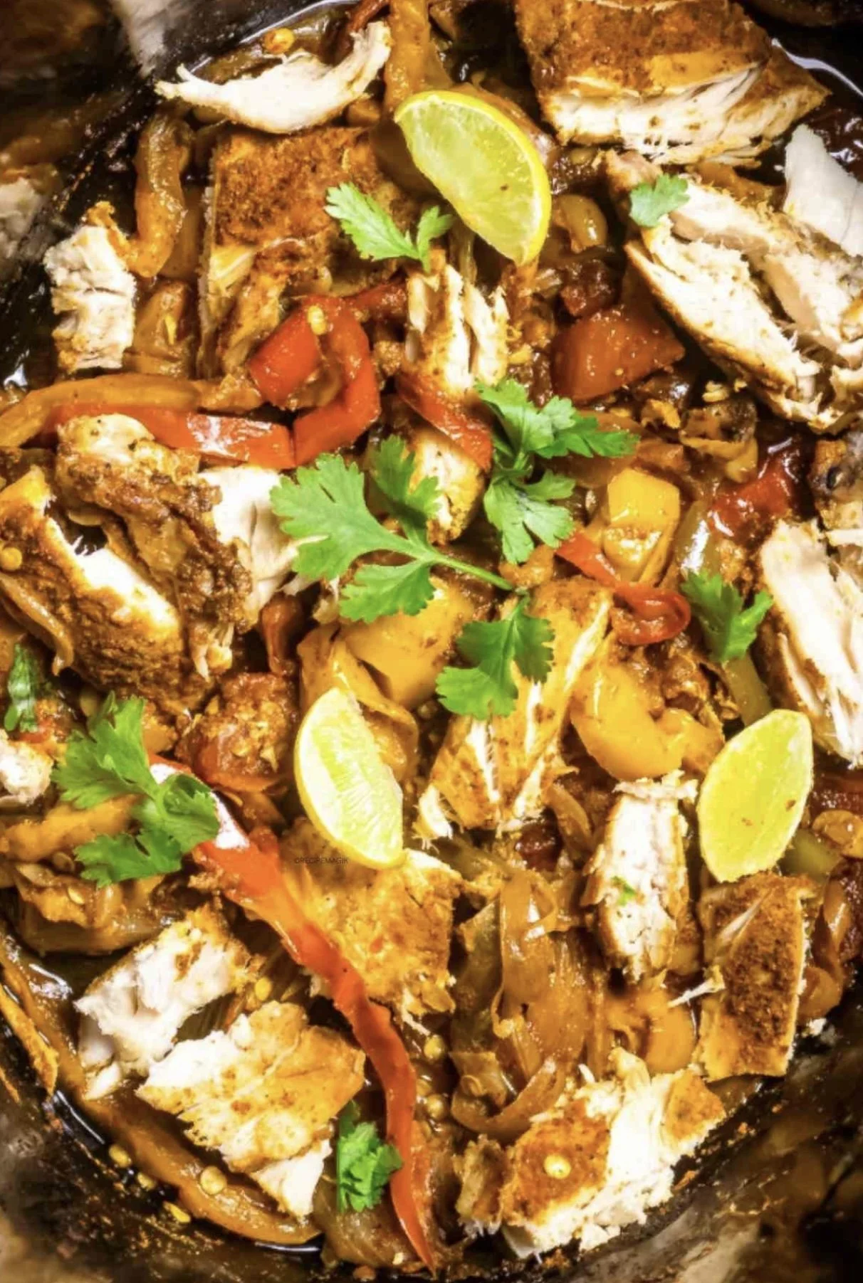 CARNITAS AND FAJITA STYLE CHICKEN ATOP SEASONED BLACK AND PINTO BEANS,